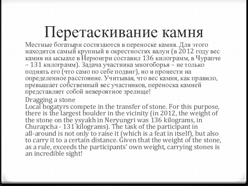 Local bogatyrs compete in the transfer of stone. For this purpose, there is the largest boulder in the vicinity (in 2012, the weight of the stone on the ysyakh in Neryungri was 136 kilograms, in Churapcha - 131 kilograms). The task of the participant in all-around is not only to raise it (which is a feat in itself), but also to carry it to a certain distance. Given that the weight of the stone, as a rule, exceeds the participants' own weight, carrying stones is an incredible sight!