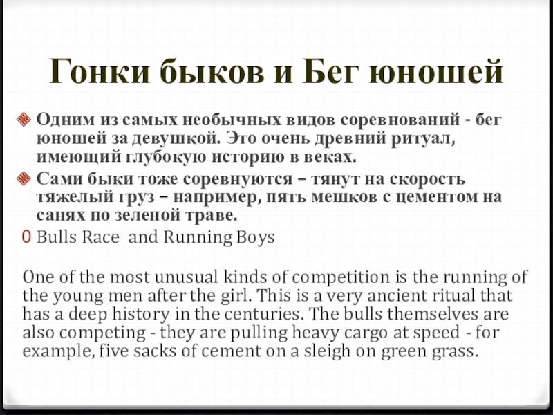 One of the most unusual kinds of competition is the running of the young men after the girl. This is a very ancient ritual that has a deep history in the centuries. The bulls themselves are also competing - they are pulling heavy cargo at speed - for example, five sacks of cement on a sleigh on green grass.