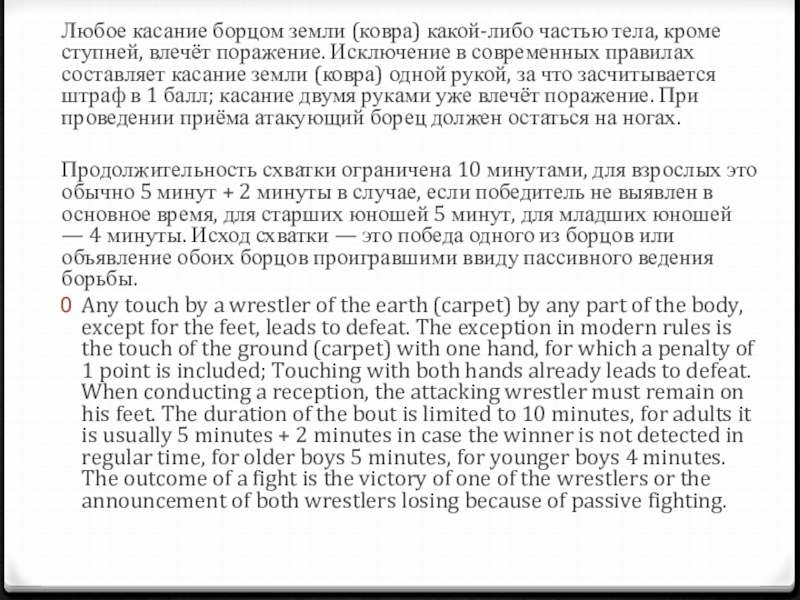 Any touch by a wrestler of the earth (carpet) by any part of the body, except for the feet, leads to defeat. The exception in modern rules is the touch of the ground (carpet) with one hand, for which a penalty of 1 point is included; Touching with both hands already leads to defeat. When conducting a reception, the attacking wrestler must remain on his feet. The duration of the bout is limited to 10 minutes, for adults it is usually 5 minutes + 2 minutes in case the winner is not detected in regular time, for older boys 5 minutes, for younger boys 4 minutes. The outcome of a fight is the victory of one of the wrestlers or the announcement of both wrestlers losing because of passive fighting.