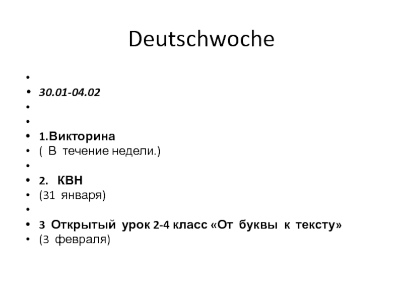 Deutschwoche 30.01-04.02 	1.Викторина ( В течение недели.) 2.  КВН (31 января) 3 Открытый урок 2-4 класс «От буквы к тексту»(3
