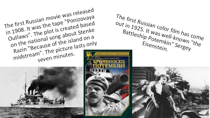 The first Russian movie was released in 1908. It was the tape "Ponizovaya Outlaws". The plot is created based on the national song about Stenke Razin "Because of the island on a midstream". The picture lasts only seven minutes.