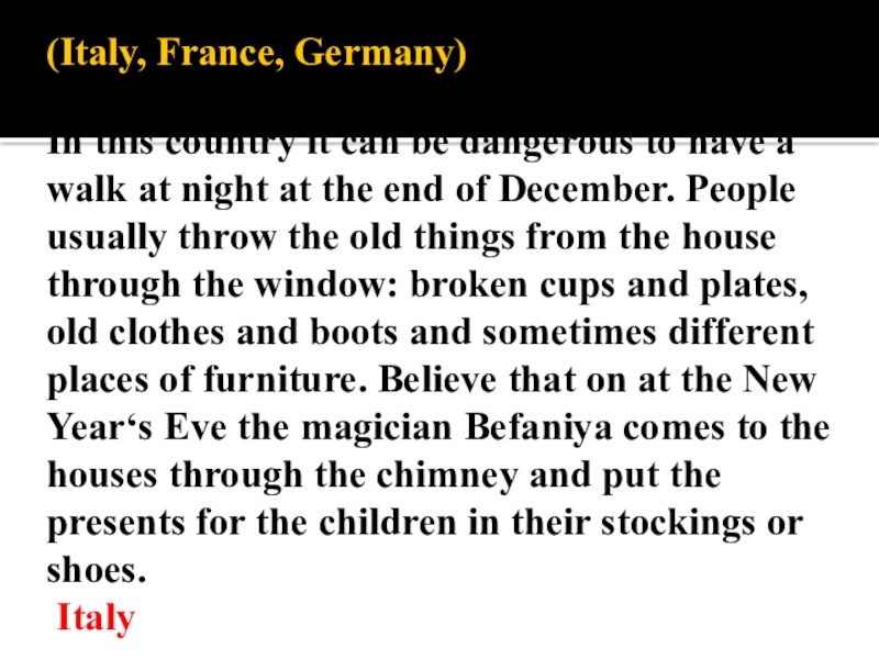 a walk at night at the end of December. People usually throw the old things from the house through the window: broken cups and plates, old clothes and boots and sometimes different places of furniture. Believe that on at the New Year‘s Eve the magician Befaniya comes to the houses through the chimney and put the presents for the children in their stockings or shoes. Italy