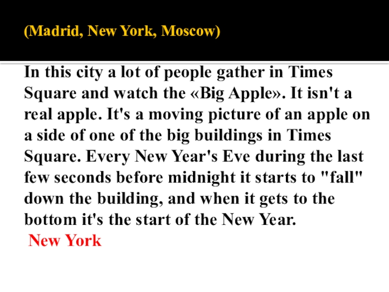 (Madrid, New York, Moscow) In this city a lot of people gather in Times Square and watch the «Big Apple». It isn't a real apple. It's a moving picture of an apple