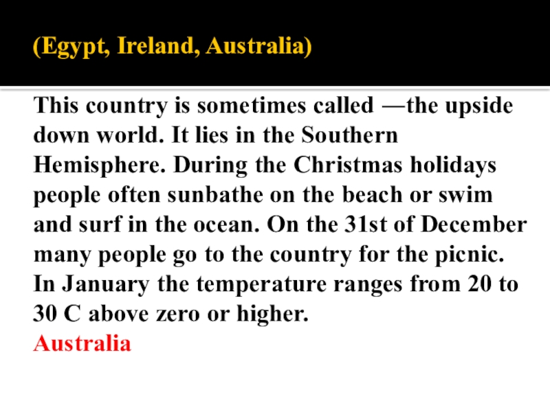 Слайд 5 (Egypt, Ireland, Australia) This country is sometimes called ―the upside down