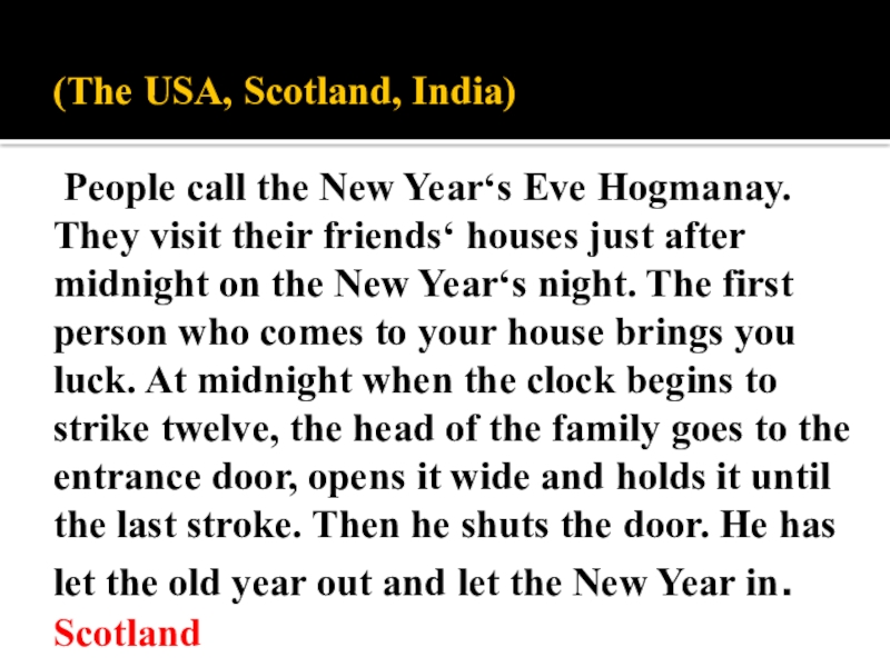 Слайд 4 (The USA, Scotland, India) People call the New Year‘s Eve Hogmanay.