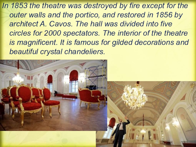 outer walls and the portico, and restored in 1856 by architect A. Cavos. The hall was divided into five circles for 2000 spectators. The interior of the theatre is magnificent. It is famous for gilded decorations and beautiful crystal chandeliers.