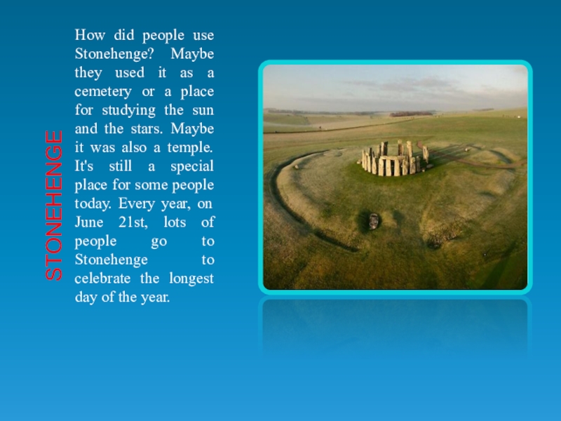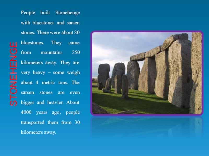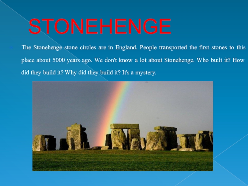 stones to this place about 5000 years ago. We don't know a lot about Stonehenge. Who built it? How did they build it? Why did they build it? It's a mystery.