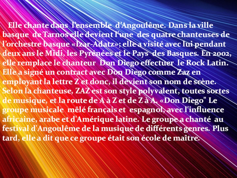 de Tarnos elle devient l'une des quatre chanteuses de l’orchestre basque «Izar-Adatz»; elle a visité avec lui pendant deux ans le Midi, les Pyrénées et le Pays des Basques. En 2002, elle remplace le chanteur Don Diego effectuer le Rock Latin. Elle a signé un contract avec Don Diego comme Zaz en employant la lettre Z et donc, il devient son nom de scène. Selon la chanteuse, ZAZ est son style polyvalent, toutes sortes de musique, et la route de A à Z et de Z à A. «Don Diego" Le groupe musicale mêlé français et espagnol, avec l'influence africaine, arabe et d'Amérique latine. Le groupe a chanté au festival d'Angoulême de la musique de différents genres. Plus tard, elle a dit que ce groupe était son école de maître.