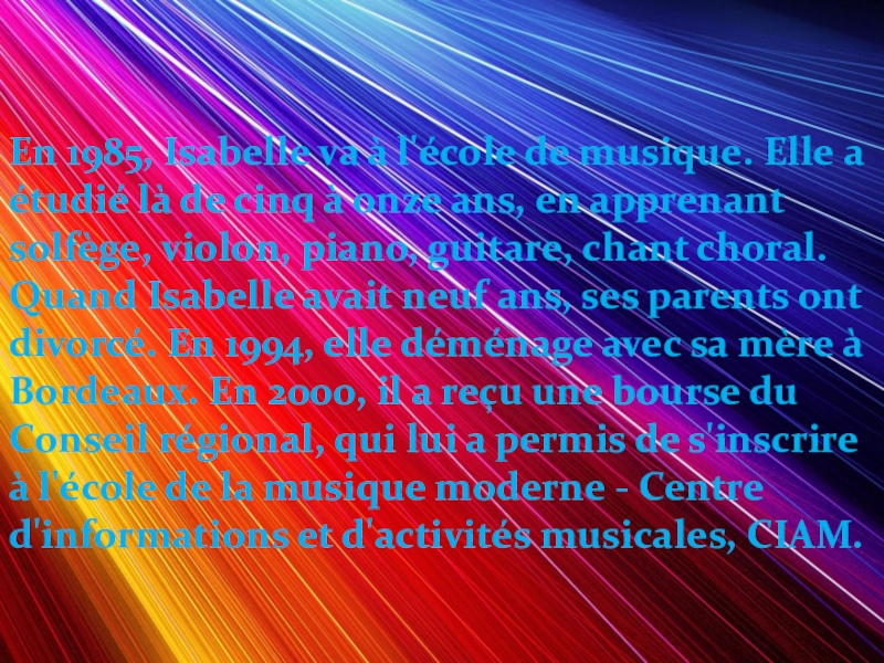 Слайд 3En 1985, Isabelle va à l'école de musique. Elle a étudié