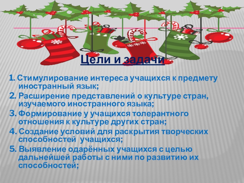 Цели и задачи 1. Стимулирование интереса учащихся к предмету иностранный язык;2. Расширение представлений о культуре стран, изучаемого иностранного