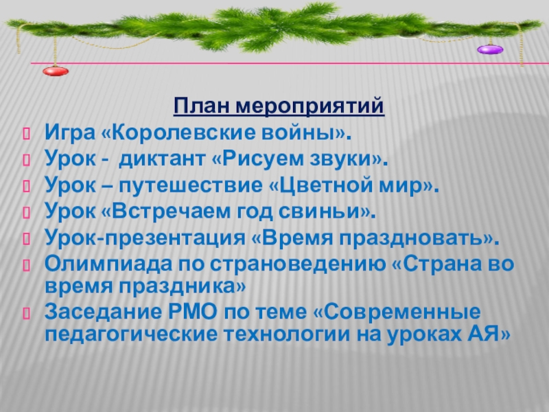 План мероприятийИгра «Королевские войны».Урок - диктант «Рисуем звуки».Урок – путешествие «Цветной мир».Урок «Встречаем год свиньи».Урок-презентация «Время праздновать».Олимпиада