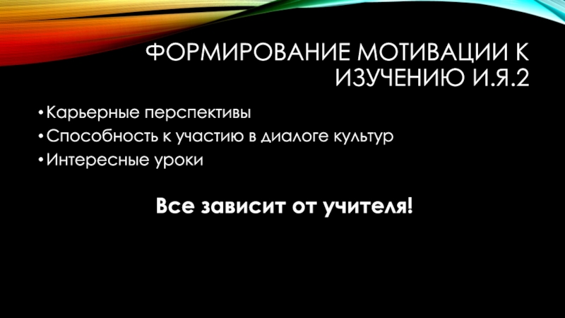 Формирование МОТИВАЦИИ К ИЗУЧЕНИЮ И.Я.2 Карьерные перспективыСпособность к участию в диалоге культурИнтересные уроки Все зависит от учителя!