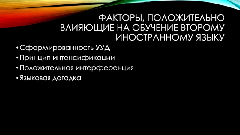 Факторы, положительно влияющие на обучение второму иностранному языкуСформированность УУДПринцип интенсификацииПоложительная интерференцияЯзыковая догадка
