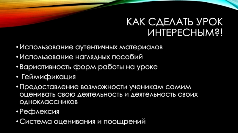 Как сделать урок интересным?!Использование аутентичных материаловИспользование наглядных пособийВариативность форм работы на уроке ГеймификацияПредоставление возможности ученикам самим оценивать