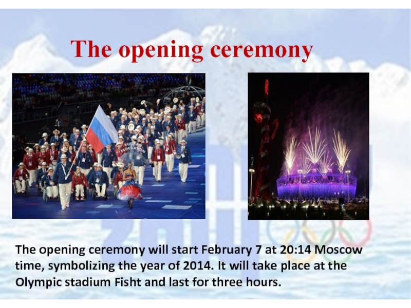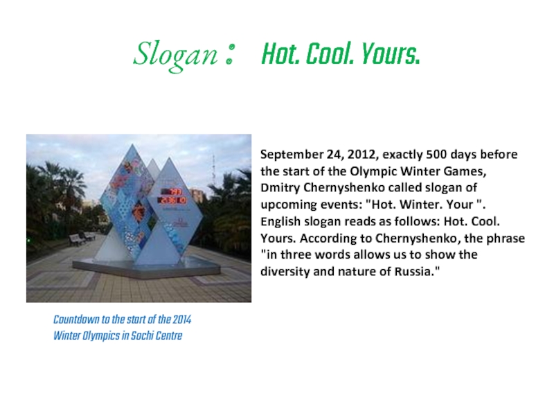 September 24, 2012, exactly 500 days before the start of the Olympic Winter Games, Dmitry Chernyshenko called slogan of upcoming events: "Hot. Winter. Your ". English slogan reads as follows: Hot. Cool. Yours. According to Chernyshenko, the phrase "in three words allows us to show the diversity and nature of Russia."