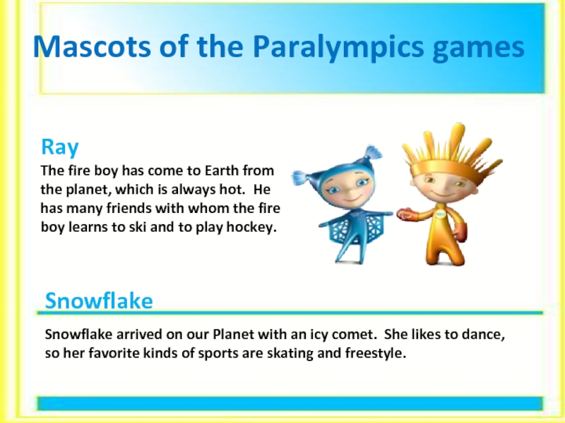 Snowflake arrived on our Planet with an icy comet. She likes to dance, so her favorite kinds of sports are skating and freestyle.