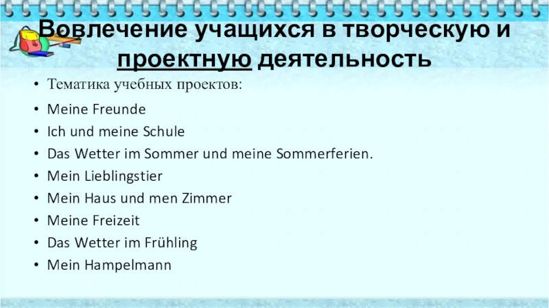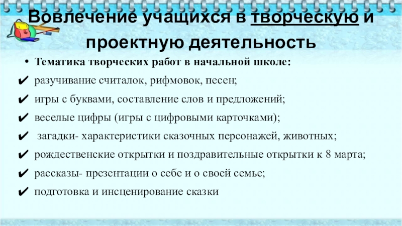 Слайд 13Вовлечение учащихся в творческую и проектную деятельность