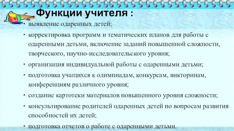 Одарённым детям даются домашние задания повышенной трудности с использованием внепрограммного материала по интересам, особенно при подготовке учащихся к школьным и районным олимпиадам, конкурсам.