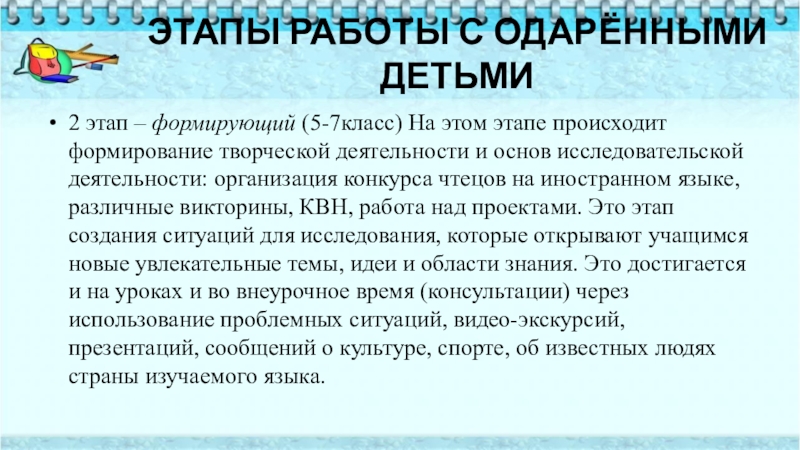 основ исследовательской деятельности: организация конкурса чтецов на иностранном языке, различные викторины, КВН, работа над проектами. Это этап создания ситуаций для исследования, которые открывают учащимся новые увлекательные темы, идеи и области знания. Это достигается и на уроках и во внеурочное время (консультации) через использование проблемных ситуаций, видео-экскурсий, презентаций, сообщений о культуре, спорте, об известных людях страны изучаемого языка.