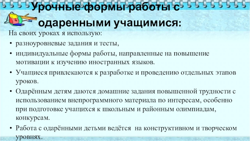 индивидуальные формы работы, направленные на повышение мотивации к изучению иностранных языков.