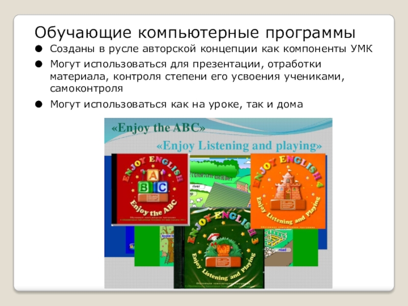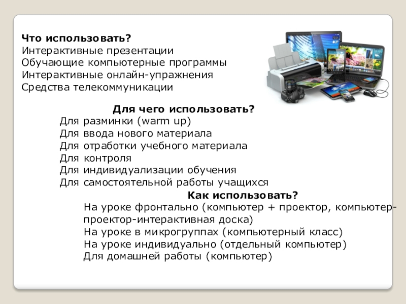с учеником, упражнения true-false, отгадывание и т.д. (о создании интерактивных презентаций см. материалы мастеркласса Т.М. Капрановой «Создание эффективных презентаций» http://www.englishteachers.ru/forum/index.php?showtopic=1658&view=findpost&p=3677)