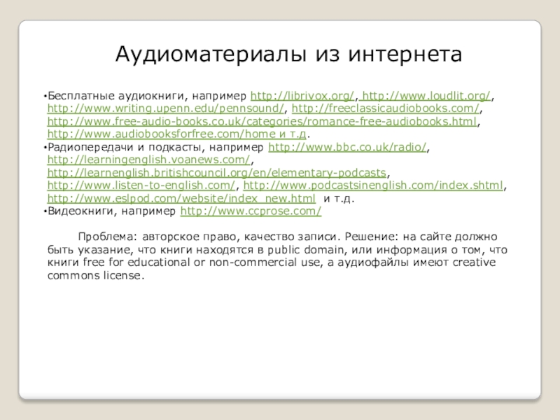 Проблема: авторское право, качество записи. Решение: на сайте должно быть указание, что книги находятся в public domain, или информация о том, что книги free for educational or non-commercial use, а аудиофайлы имеют creative commons license.