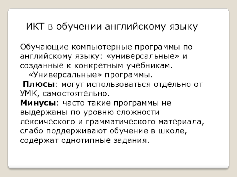 Минусы: часто такие программы не выдержаны по уровню сложности лексического и грамматического материала, слабо поддерживают обучение в школе, содержат однотипные задания.