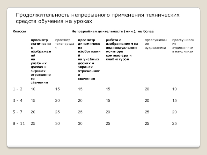 Слайд 8Продолжительность непрерывного применения технических средств обучения на уроках