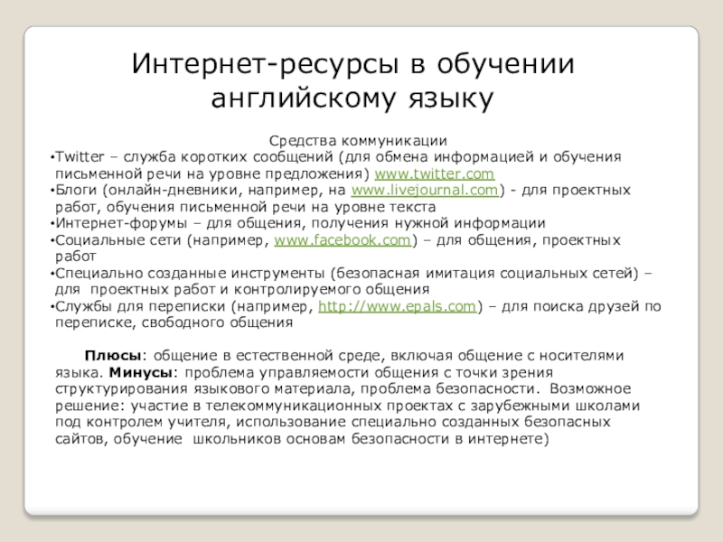 Плюсы: общение в естественной среде, включая общение с носителями языка. Минусы: проблема управляемости общения с точки зрения структурирования языкового материала, проблема безопасности. Возможное решение: участие в телекоммуникационных проектах с зарубежными школами под контролем учителя, использование специально созданных безопасных сайтов, обучение школьников основам безопасности в интернете)