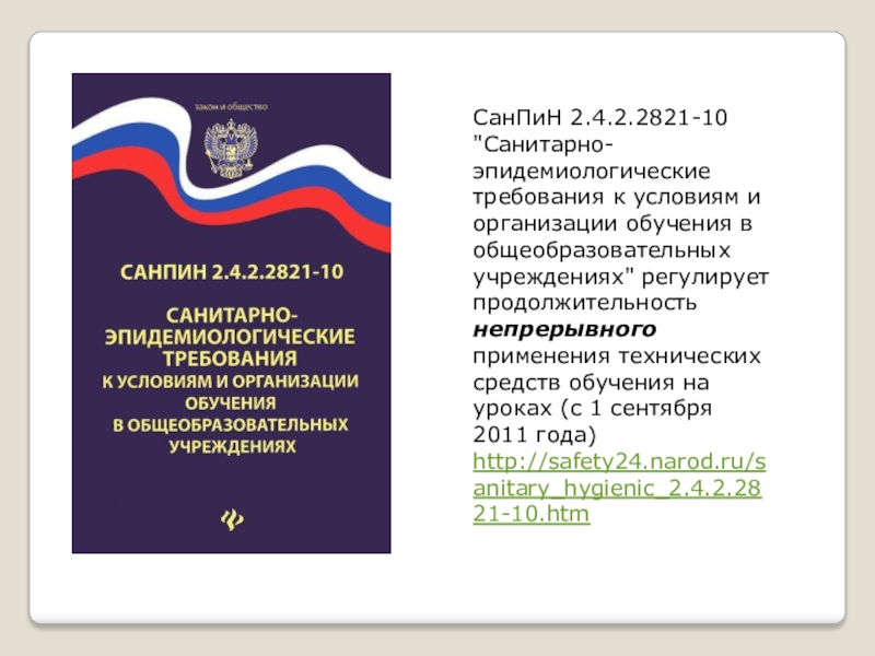 Слайд 9СанПиН 2.4.2.2821-10 "Санитарно-эпидемиологические требования к условиям и организации обучения в общеобразовательных