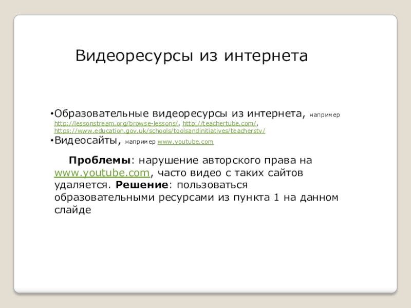 Проблемы: нарушение авторского права на www.youtube.com, часто видео с таких сайтов удаляется. Решение: пользоваться образовательными ресурсами из пункта 1 на данном слайде