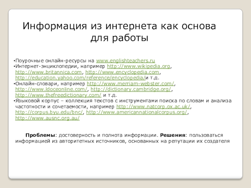 Поурочные ресурсы www.englishteachers.ru , энциклопедии, корпус