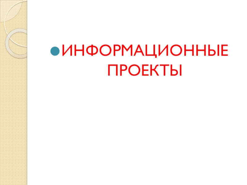Информационные – требуют от участников изначальной направленности на сбор информации о каком-либо объекте, явлении; ознакомления участников проекта с этой информацией, ее анализа и обобщения фактов, предназначенных для широкой аудитории.