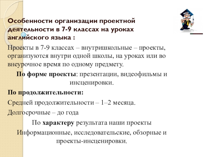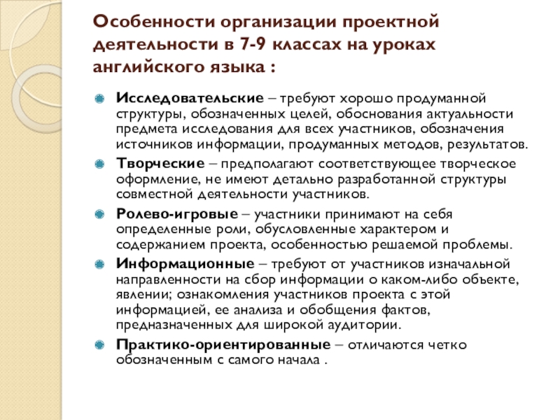 Слайд 12Особенности организации проектной деятельности в 7-9 классах на уроках английского языка