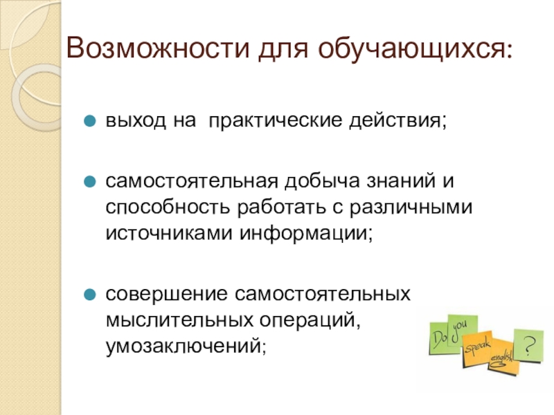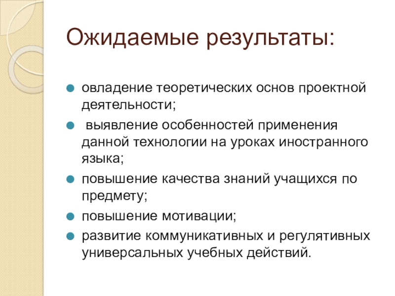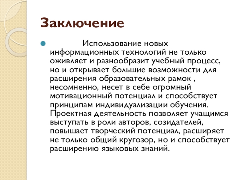 процесс, но и открывает большие возможности для расширения образовательных рамок , несомненно, несет в себе огромный мотивационный потенциал и способствует принципам индивидуализации обучения. Проектная деятельность позволяет учащимся выступать в роли авторов, созидателей, повышает творческий потенциал, расширяет не только общий кругозор, но и способствует расширению языковых знаний.