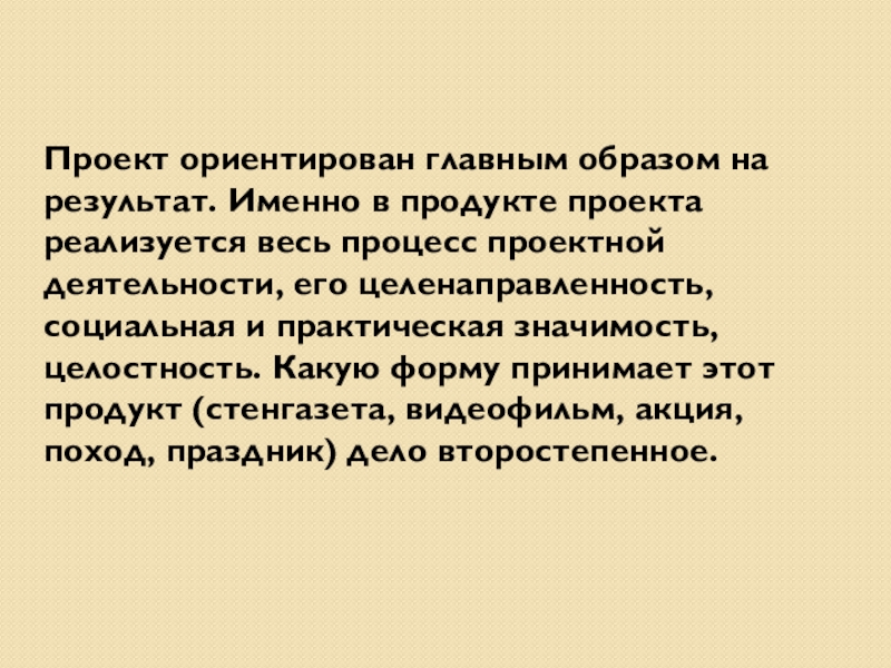 весь процесс проектной деятельности, его целенаправленность, социальная и практическая значимость, целостность. Какую форму принимает этот продукт (стенгазета, видеофильм, акция, поход, праздник) дело второстепенное.