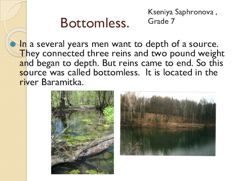 of a source. They connected three reins and two pound weight and began to depth. But reins came to end. So this source was called bottomless. It is located in the river Baramitka.