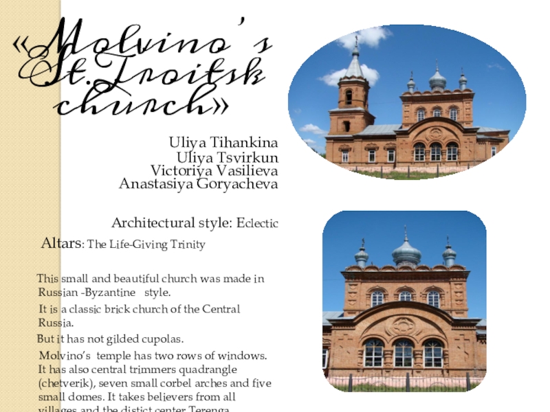 Molvino’s temple has two rows of windows. It has also central trimmers quadrangle (chetverik), seven small corbel arches and five small domes. It takes believers from all villages and the distict center Terenga.