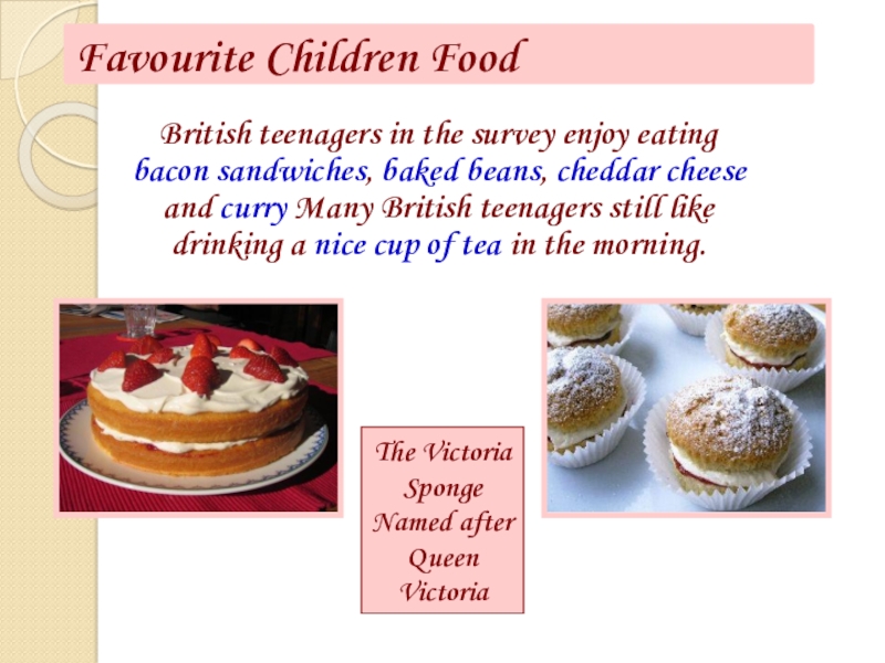 the survey enjoy eating bacon sandwiches, baked beans, cheddar cheese and curry Many British teenagers still like drinking a nice cup of tea in the morning.