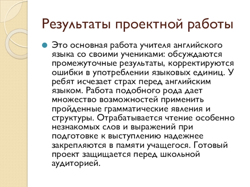 учениками: обсуждаются промежуточные результаты, корректируются ошибки в употреблении языковых единиц. У ребят исчезает страх перед английским языком. Работа подобного рода дает множество возможностей применить пройденные грамматические явления и структуры. Отрабатывается чтение особенно незнакомых слов и выражений при подготовке к выступлению надежнее закрепляются в памяти учащегося. Готовый проект защищается перед школьной аудиторией.