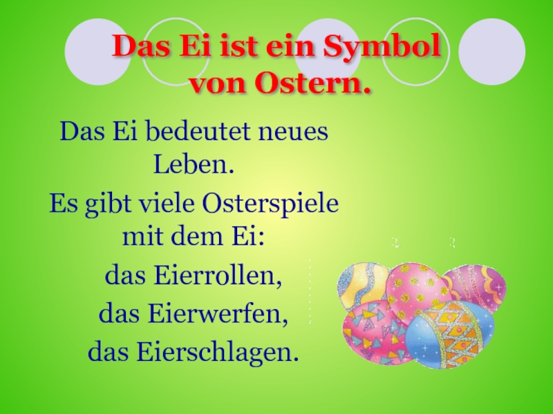 Das Ei ist ein Symbol  von Ostern.Das Ei bedeutet neues Leben. Es gibt viele Osterspiele mit