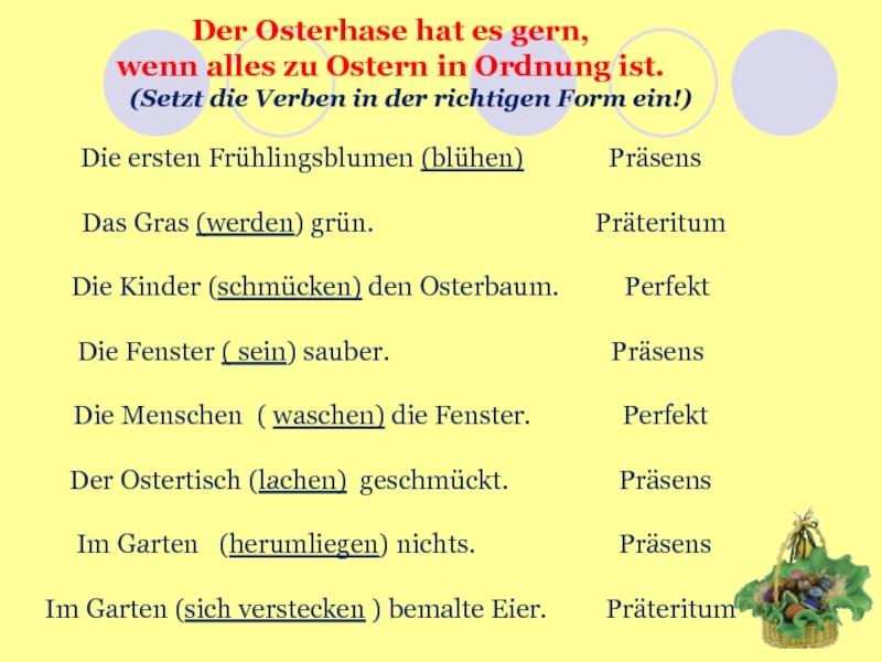 Der Osterhase hat es gern, wenn alles zu Ostern in Ordnung ist.   (Setzt die Verben
