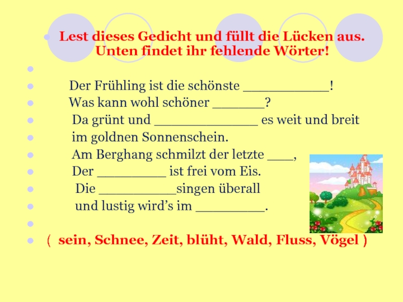 Слайд 3Lest dieses Gedicht und füllt die Lücken aus. Unten findet ihr