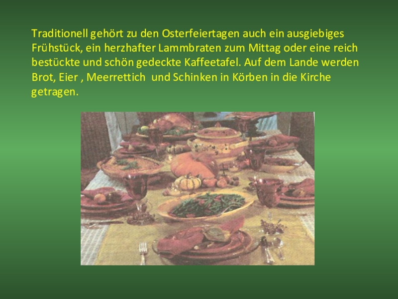 Слайд 5Traditionell gehört zu den Osterfeiertagen auch ein ausgiebiges Frühstück, ein herzhafter