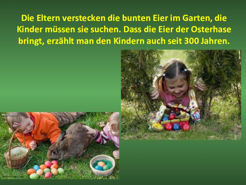 Слайд 10Die Eltern verstecken die bunten Eier im Garten, die Kinder müssen