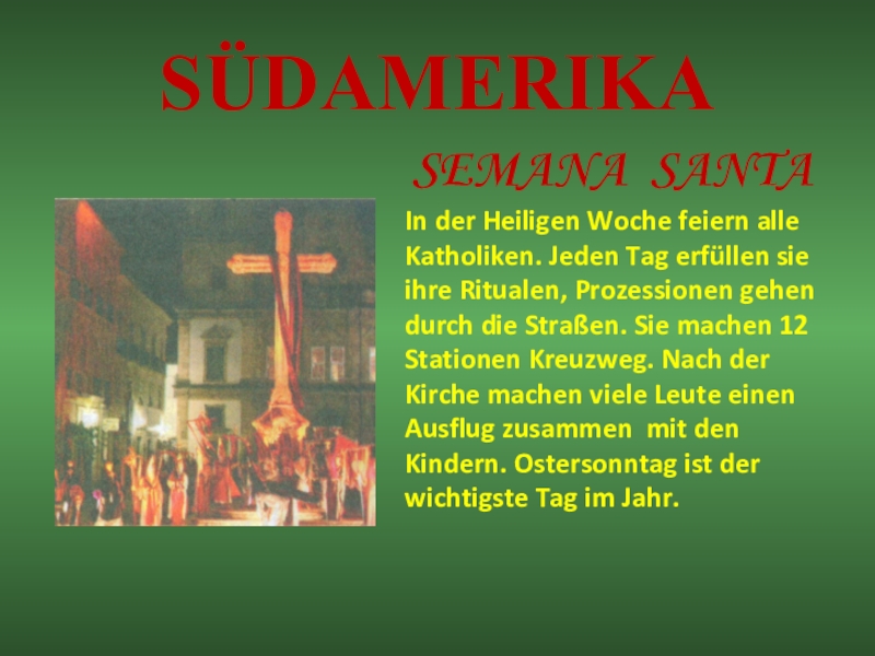 sie ihre Ritualen, Prozessionen gehen durch die Straßen. Sie machen 12 Stationen Kreuzweg. Nach der Kirche machen viele Leute einen Ausflug zusammen mit den Kindern. Ostersonntag ist der wichtigste Tag im Jahr.