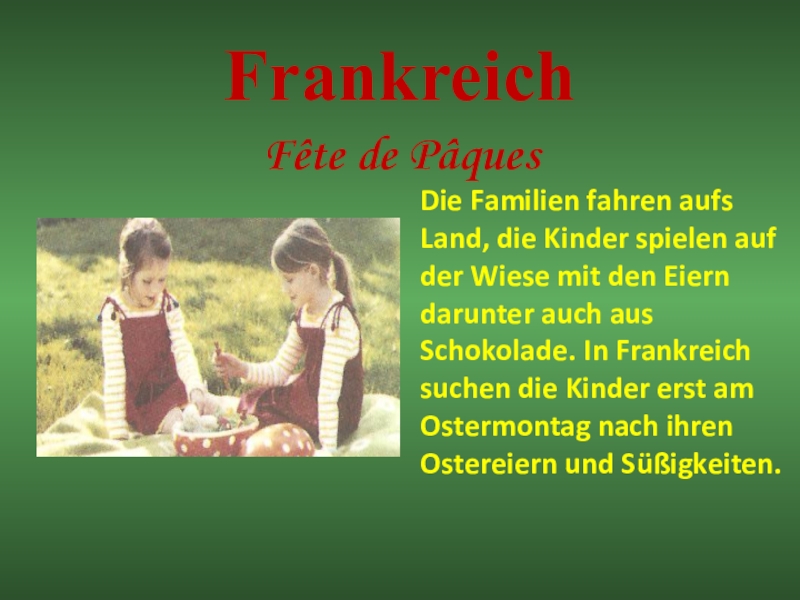auf der Wiese mit den Eiern darunter auch aus Schokolade. In Frankreich suchen die Kinder erst am Ostermontag nach ihren Ostereiern und Süßigkeiten.