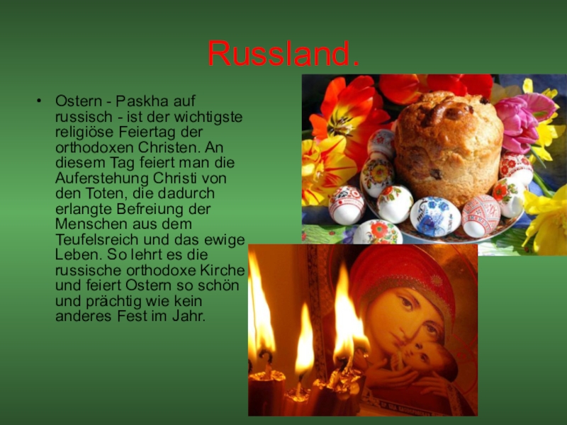 der orthodoxen Christen. An diesem Tag feiert man die Auferstehung Christi von den Toten, die dadurch erlangte Befreiung der Menschen aus dem Teufelsreich und das ewige Leben. So lehrt es die russische orthodoxe Kirche und feiert Ostern so schön und prächtig wie kein anderes Fest im Jahr.