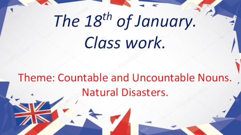 Слайд 1The 18th of January. Class work. Theme: Countable and Uncountable Nouns. Natural Disasters.