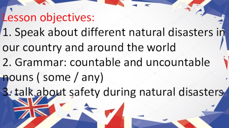 Lesson objectives: 1. Speak about different natural disasters in our country and around the world 2. Grammar: countable and uncountable nouns ( some / any) 3. talk about safety during natural disasters